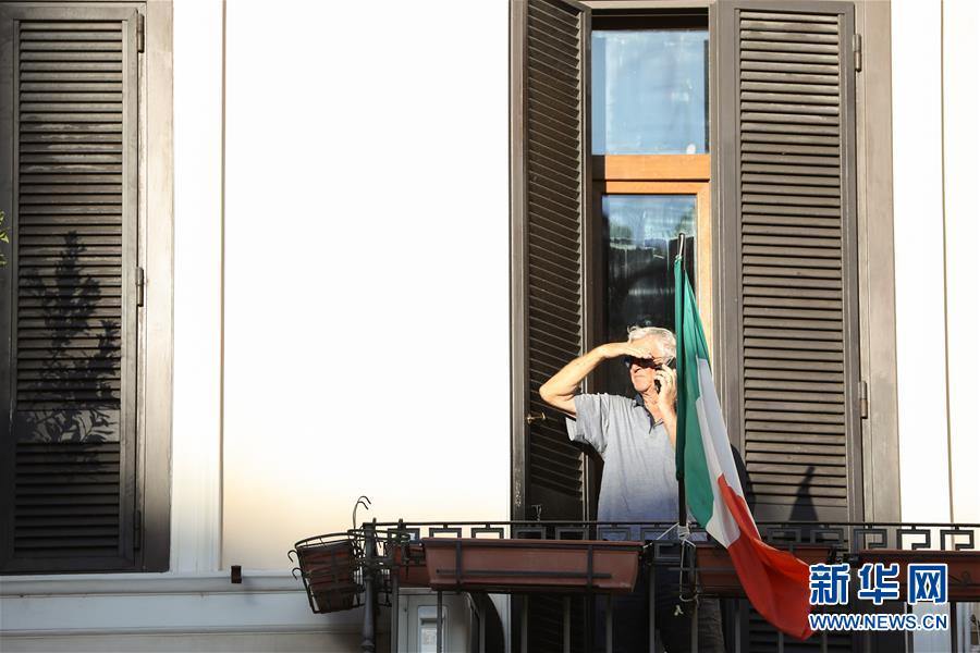 8月4日,在意大利首都羅馬,一名男子在陽臺打電話。受新冠疫情影響,今年夏天羅馬的歷史中心區(qū)游客比往年明顯減少。新華社記者程婷婷攝