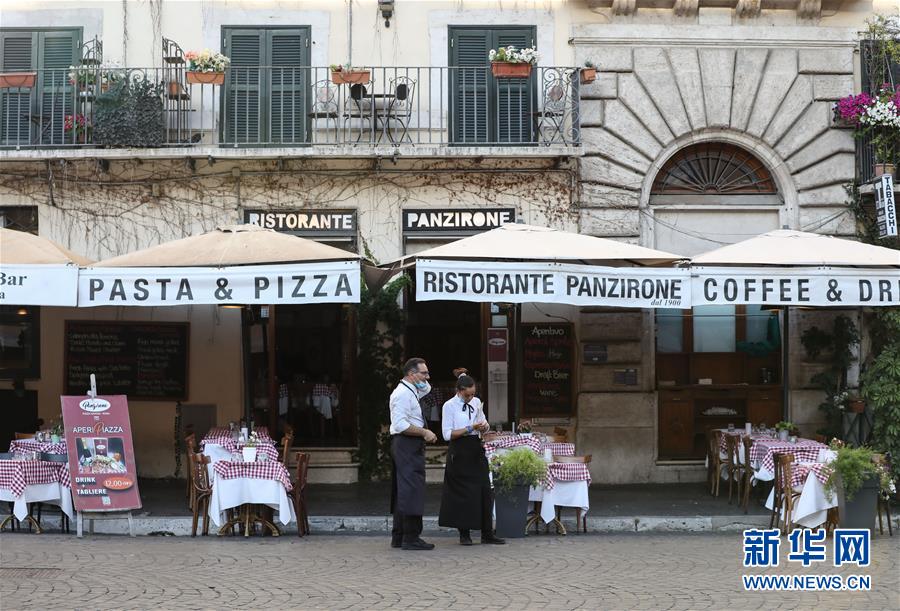 8月4日,在意大利首都羅馬,一家餐廳的工作人員站在門口招攬顧客。受新冠疫情影響,今年夏天羅馬的歷史中心區(qū)游客比往年明顯減少。新華社記者程婷婷攝