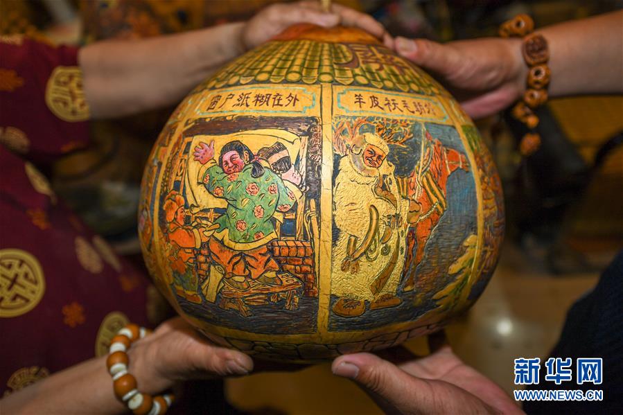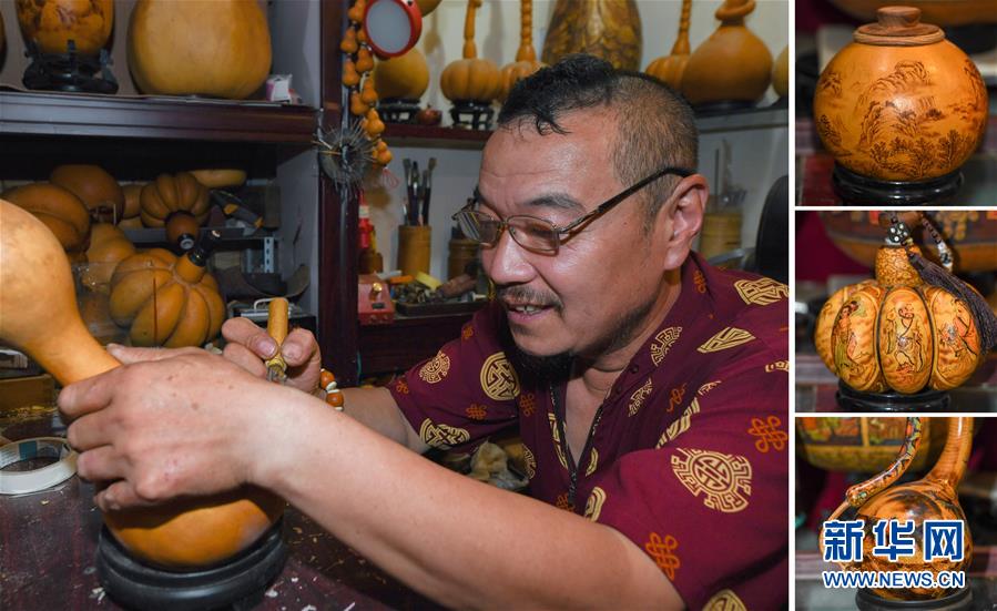 這是侯景偉創(chuàng)作的民俗主題葫蘆工藝品(8月5日攝)。今年55歲的吉林四平人侯景偉自幼與家人學(xué)習(xí)雕刻、烙畫藝術(shù)。經(jīng)過多年潛心研究,他將浮雕和烙畫工藝相結(jié)合,通過拋光、起稿、雕刻、烙燙、套色等十余道工藝,制作展現(xiàn)傳統(tǒng)文化、民俗故事的葫蘆工藝品。2020年,侯景偉被評為四平市非物質(zhì)文化遺產(chǎn)項目侯氏葫蘆雕刻烙畫代表性傳承人。他說:“希望有更多人加入到非遺傳承隊伍中,讓小葫蘆‘講’出更多民俗故事?!毙氯A社記者張楠攝