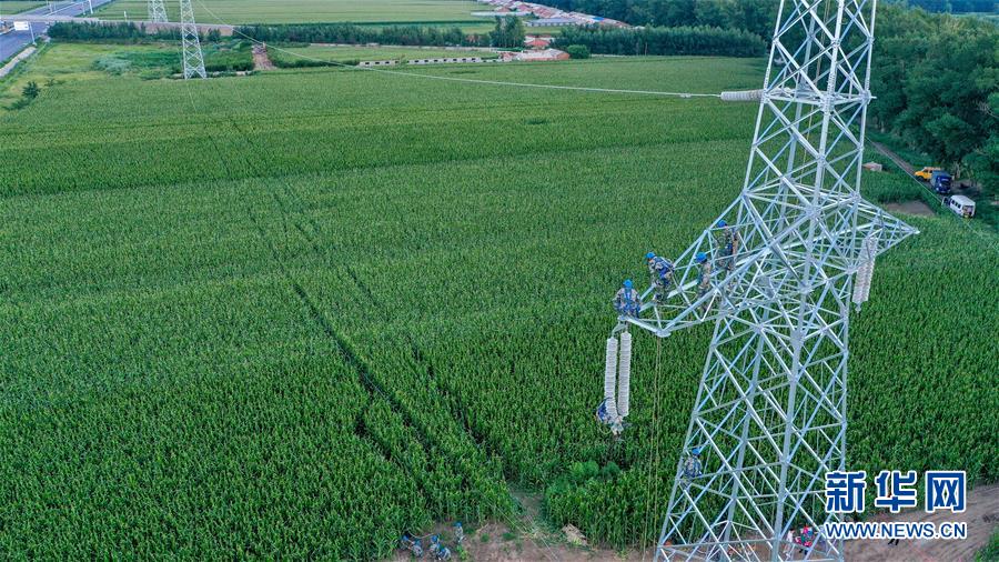 8月6日,幾名送電工在吉林省長春市城郊的一處輸電鐵塔上施工作業(yè)(無人機(jī)照片)。吉林省長春市連續(xù)多日出現(xiàn)高溫天氣,國網(wǎng)長春供電公司輸電運(yùn)檢中心的送電工們每天清晨開始作業(yè),不畏烈日“烤”驗(yàn),堅(jiān)守工作崗位,確保工程按計劃完成。新華社記者張楠攝