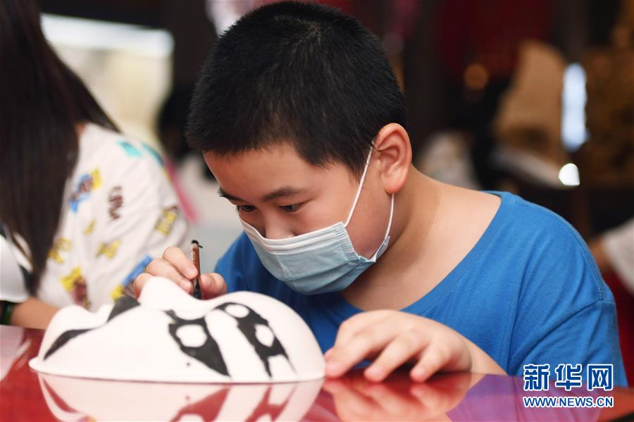 8月8日,小朋友在長沙市非物質文化遺產展示館體驗湘劇臉譜繪制。暑假期間,許多小朋友來到位于湖南省長沙市橘子洲景區(qū)的長沙市非物質文化遺產展示館參觀體驗。新華社記者 薛宇舸 攝