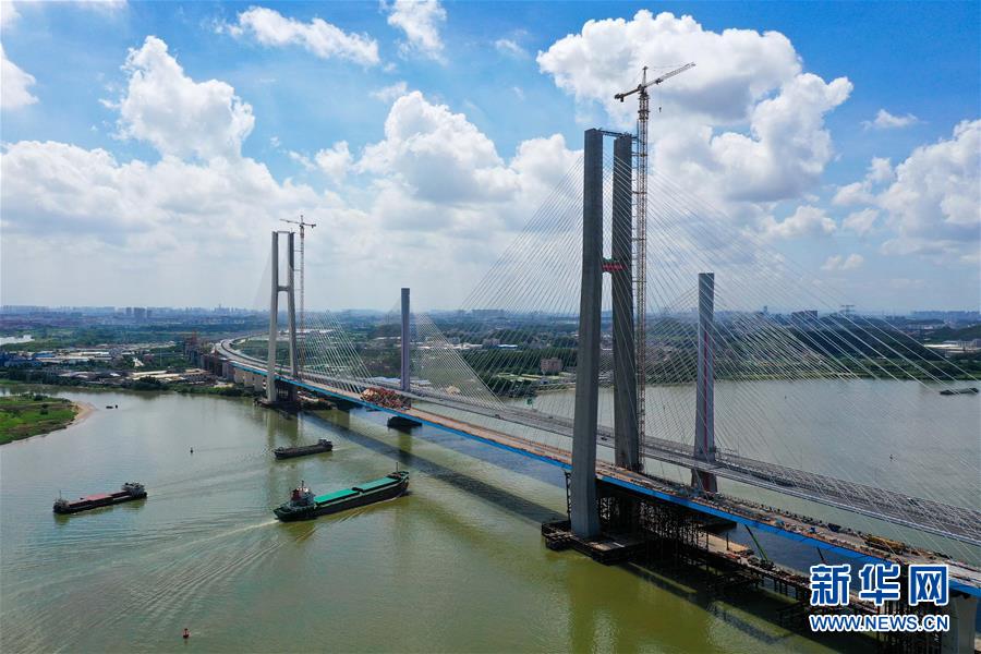 8月9日拍攝的廣州南沙港鐵路跨西江特大斜拉橋最后一塊鋼箱梁吊裝施工現(xiàn)場(chǎng)(無(wú)人機(jī)照片)。當(dāng)日,中鐵十一局承建的粵港澳大灣區(qū)基礎(chǔ)設(shè)施“硬聯(lián)通”重點(diǎn)工程——廣州南沙港鐵路跨西江特大斜拉橋完成最后一塊鋼箱梁吊裝作業(yè),大橋即將合龍。該橋位于廣東佛山市和江門(mén)市交界處,全長(zhǎng)1117.5米。新華社記者劉大偉攝。