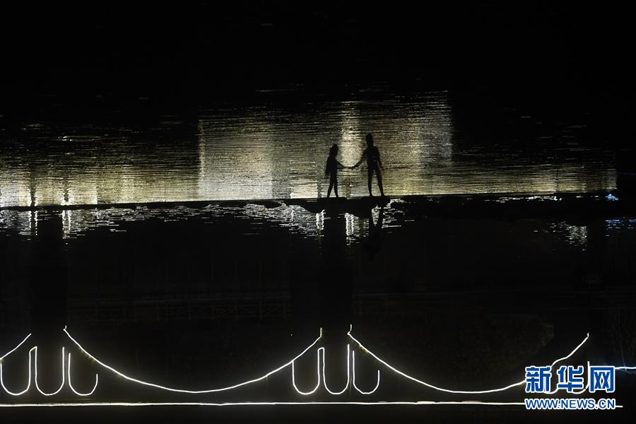游客牽手從流經(jīng)下姜村的小河橋上走過(guò)(2017年8月9日攝)。新華社記者黃宗治攝。