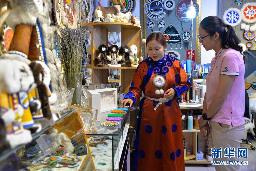 艾吉瑪(左)在內蒙古自治區(qū)鄂溫克族自治旗巴彥托海鎮(zhèn)太陽花傳承發(fā)展中心向顧客介紹手工藝品(8月6日攝)。新華社記者徐欽攝。
