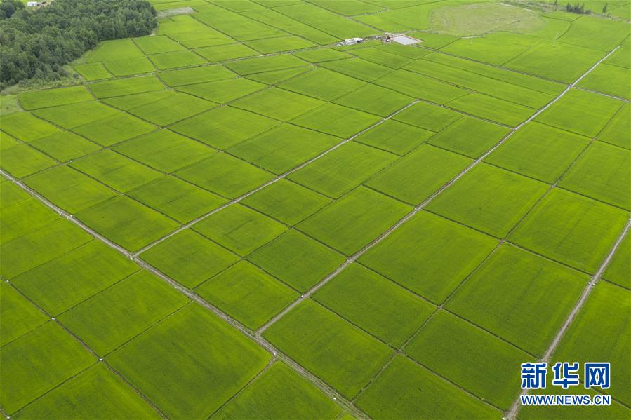8月11日在撫遠(yuǎn)市拍攝的稻田(無人機(jī)照片)。時下,“華夏東極”黑龍江省撫遠(yuǎn)市的水稻長勢良好,蒼翠的稻田一望無際,猶如綠毯鋪在大地上。新華社記者謝劍飛攝。