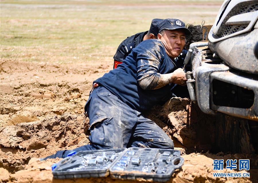7月6日,卓乃湖保護(hù)站站長秋培扎西在可可西里地區(qū)修理車輛。新華社記者張龍攝