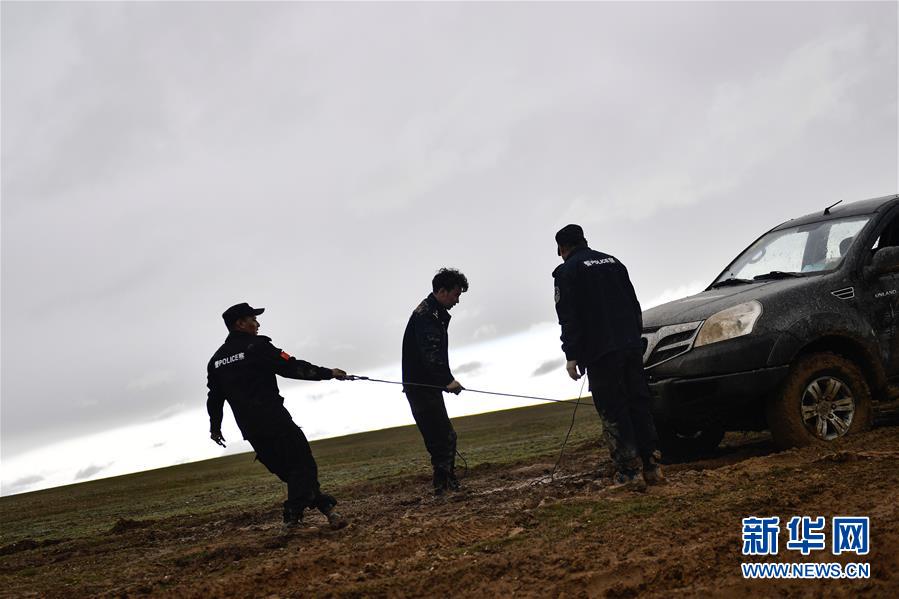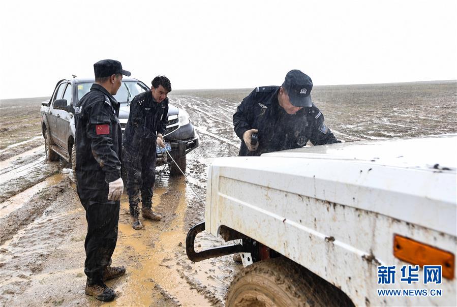 7月6日,卓乃湖保護(hù)站站長秋培扎西(右)和巡山隊員更松多杰(左)、白瑪東周在可可西里地區(qū)冒雨拉車。新華社記者張龍攝