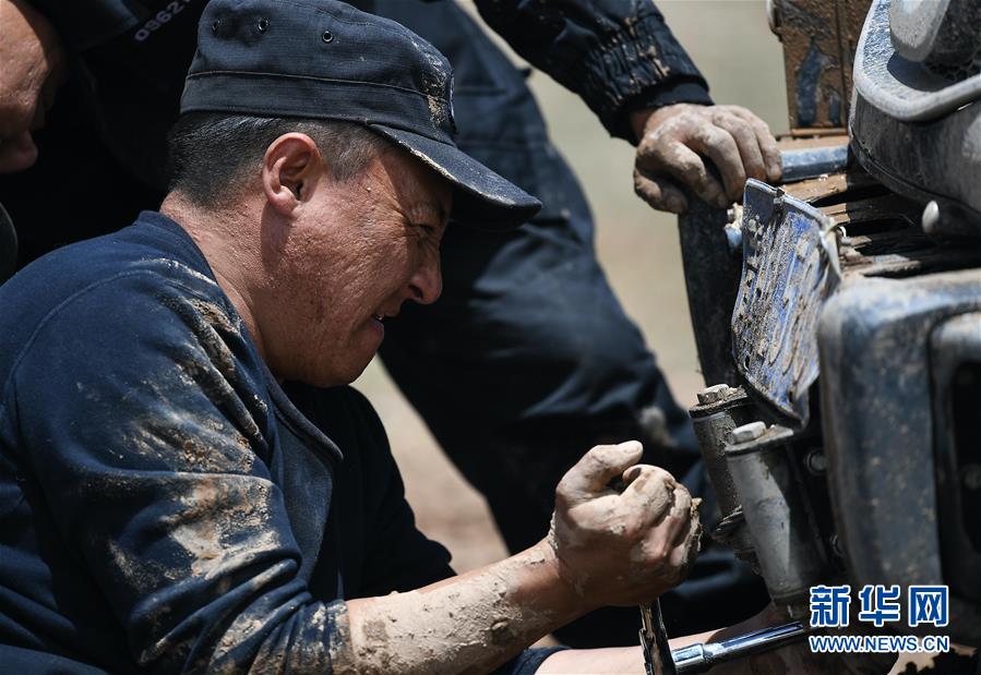 7月6日,卓乃湖保護(hù)站站長秋培扎西在可可西里地區(qū)修理車輛。新華社記者薛玉斌攝