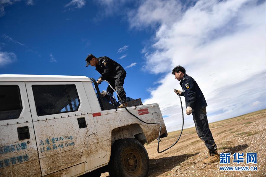 7月6日,巡山隊員更松多杰(左)和白瑪東周在可可西里地區(qū)為車輛加油。新華社記者張龍攝