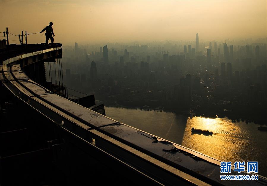 8月11日,工人在武漢綠地中心項目建設(shè)現(xiàn)場近500米的高空施工。