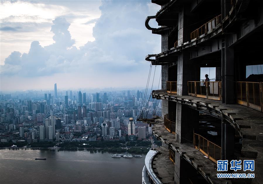 8月11日,一名工人在武漢綠地中心項目建設現(xiàn)場近500米的高空遠眺。新華社記者肖藝九攝
