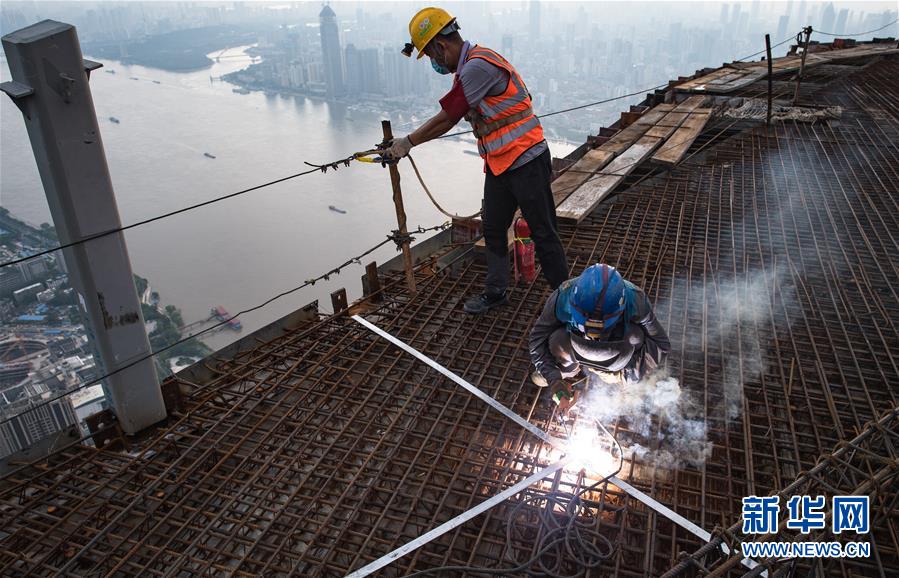 8月11日,在武漢綠地中心項(xiàng)目建設(shè)現(xiàn)場(chǎng)近500米的高空,來(lái)自中建三局二公司的工人熊明生(右)、張幸紅冒著高溫施工。新華社記者肖藝九攝