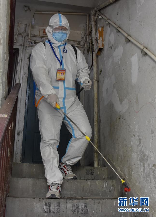 8月12日,烏魯木齊市天山區(qū)山西巷社區(qū)工作人員王志鷹在對居民樓道進(jìn)行消毒。新華社記者 高晗