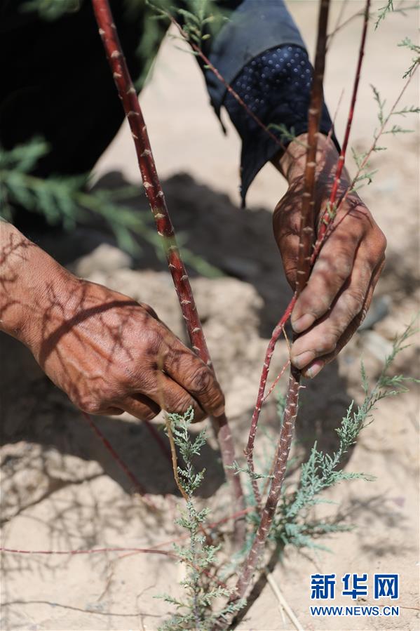 甘肅省金昌市永昌縣下四壩村村民徐文國在檢查紅柳苗的生長情況,這株紅柳苗是他今年剛栽下的(7月10日攝)。新華社記者 杜哲宇 攝