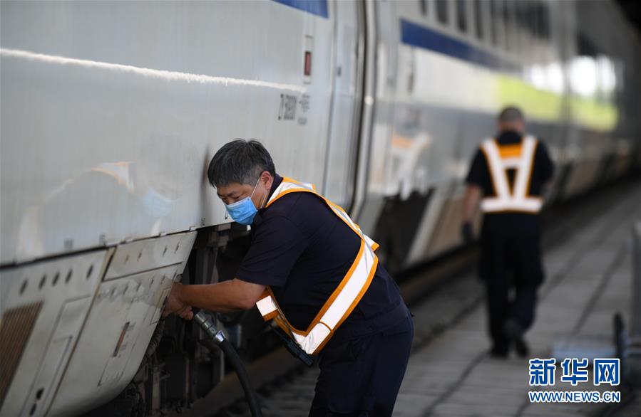 8月12日,長春火車站客運車間上水工王軍在給列車上水。進入暑運高峰,為了保障列車正常用水,每當一列火車停靠車站,長春火車站的上水工就冒著酷暑將水管插進火車底部的輸水口,快速準確完成輸水作業(yè)。新華社記者 林宏 攝