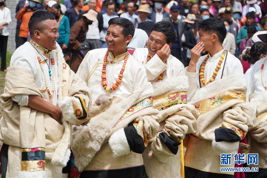 8月12日,身著節(jié)日盛裝的演員和當?shù)厝罕娫谙臐蔀┎菰咸疱伹f舞。新華社記者 耿馨寧 攝