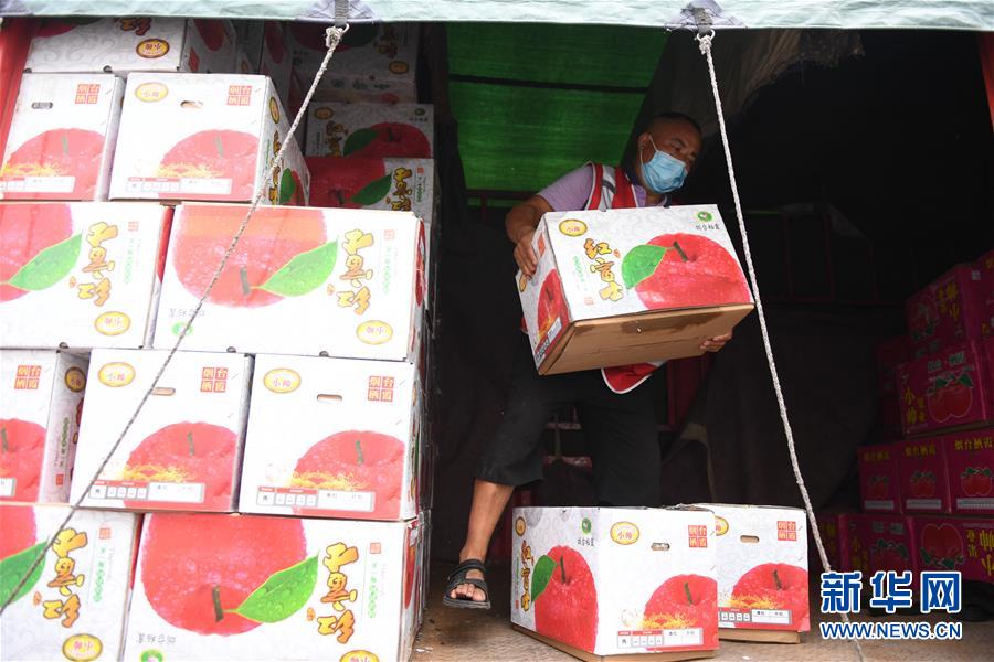 商戶在新發(fā)地批發(fā)市場(chǎng)周轉(zhuǎn)新區(qū)卸下蘋(píng)果(8月6日攝)。 新華社記者 張晨霖 攝
