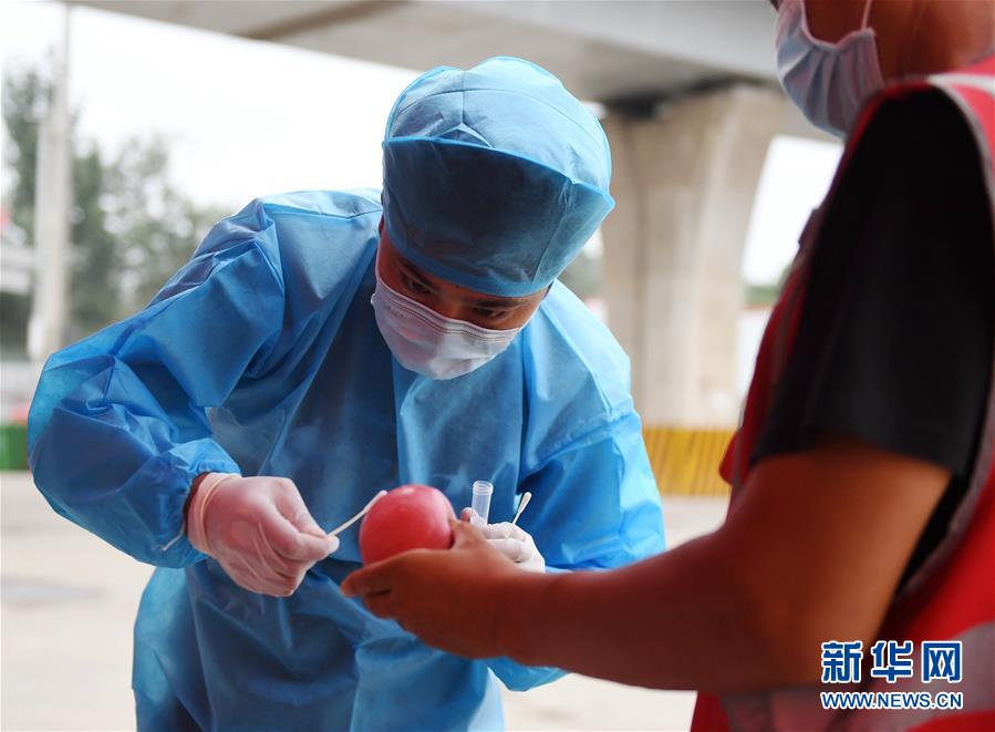 工作人員在新發(fā)地批發(fā)市場周轉(zhuǎn)新區(qū)對進(jìn)場蔬果進(jìn)行取樣(8月6日攝)。 新華社記者 張晨霖 攝