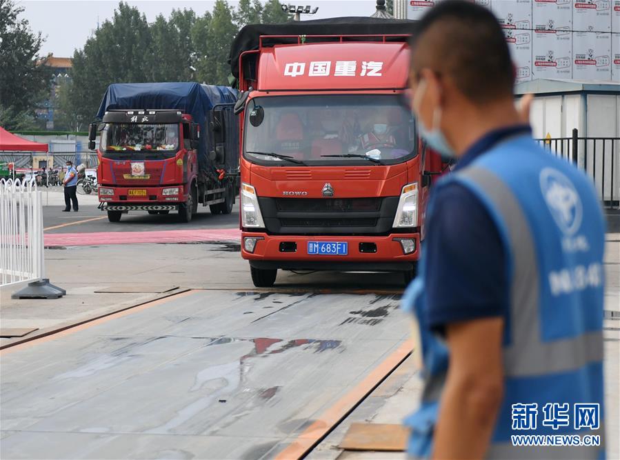 進(jìn)場(chǎng)車輛進(jìn)入新發(fā)地批發(fā)市場(chǎng)周轉(zhuǎn)新區(qū)(8月6日攝)。 新華社記者 張晨霖 攝