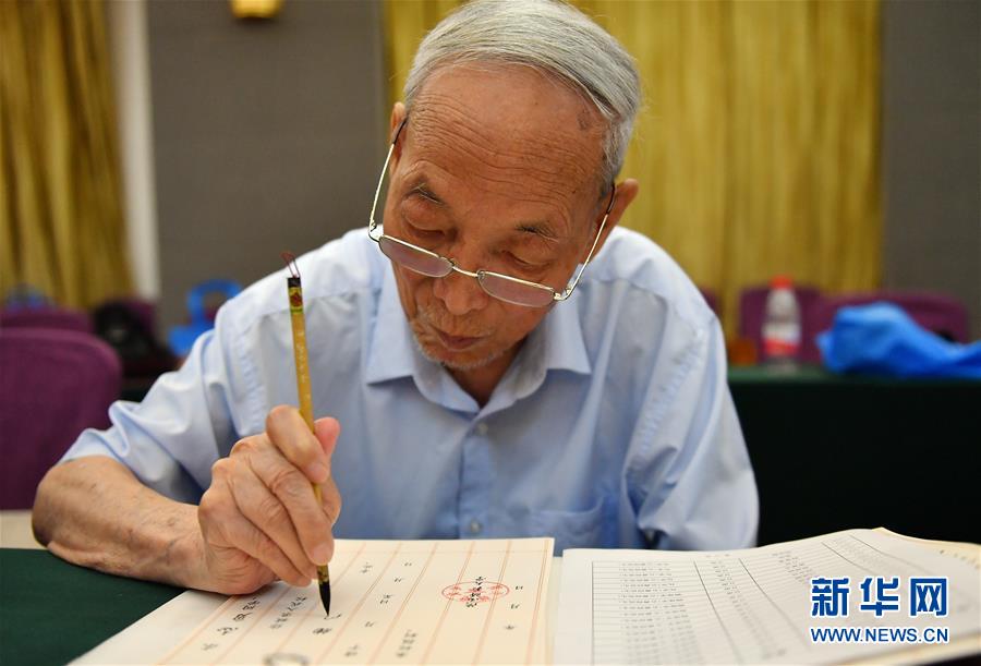 8月13日,陜西師范大學(xué)退休教師符有堂書(shū)寫(xiě)錄取通知書(shū)。當(dāng)日,陜西師范大學(xué)2020年手寫(xiě)錄取通知書(shū)正式開(kāi)筆。該校自2007年起采用毛筆書(shū)寫(xiě)錄取通知書(shū)的方式,為新生傳遞佳音。今年,學(xué)校十余位退休教師、在職教師、校友代表等書(shū)法愛(ài)好者將為約4500名新錄取的本科生送上帶著墨香的大學(xué)錄取通知書(shū)。新華社記者張博文攝