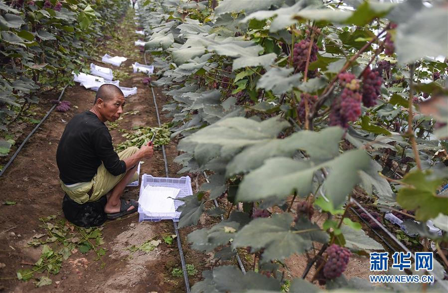8月13日,在吉林省磐石市煙筒山鎮(zhèn)民主村,村民在葡萄大棚內(nèi)采摘葡萄。時下,吉林省磐石市煙筒山鎮(zhèn)棚膜葡萄園區(qū)內(nèi)的大棚葡萄進入采摘季,農(nóng)民喜獲豐收。近年來,當?shù)赝ㄟ^“共創(chuàng)”與“扶持”相結(jié)合的模式大力發(fā)展特色農(nóng)業(yè),建設葡萄種植大棚300余棟,以此帶動村集體經(jīng)濟發(fā)展,助力農(nóng)民增收致富。新華社記者許暢攝