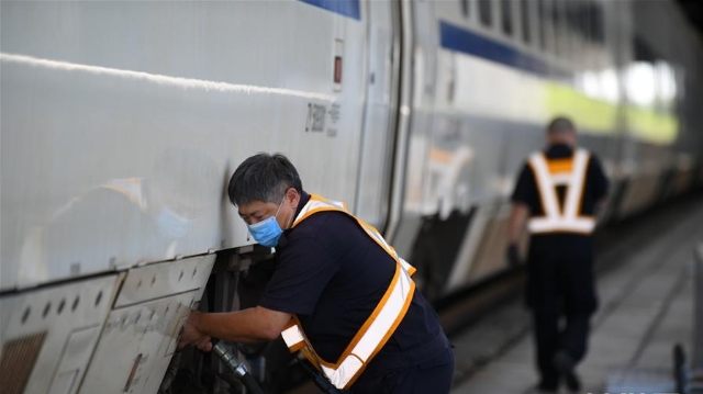 在中國(guó)鐵路上海局集團(tuán)有限公司杭州北車(chē)輛段合肥運(yùn)用車(chē)間,386名列車(chē)檢修工人頭頂烈日?qǐng)?jiān)守崗位,確保暑運(yùn)列車(chē)的安全運(yùn)行。