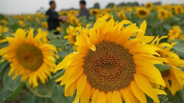 初秋時(shí)節(jié),位于甘肅省白銀市景泰縣寺灘鄉(xiāng)的十萬(wàn)畝向日葵競(jìng)相綻放,金黃的葵花張開(kāi)“笑臉”,迎接豐收。