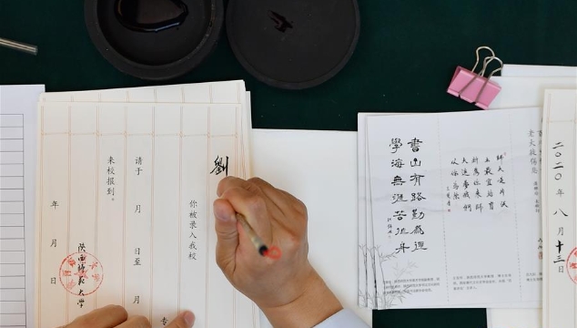 今年,學(xué)校十余位退休教師、在職教師、校友代表等書(shū)法愛(ài)好者將為約4500名新錄取的本科生送上帶著墨香的大學(xué)錄取通知書(shū)。