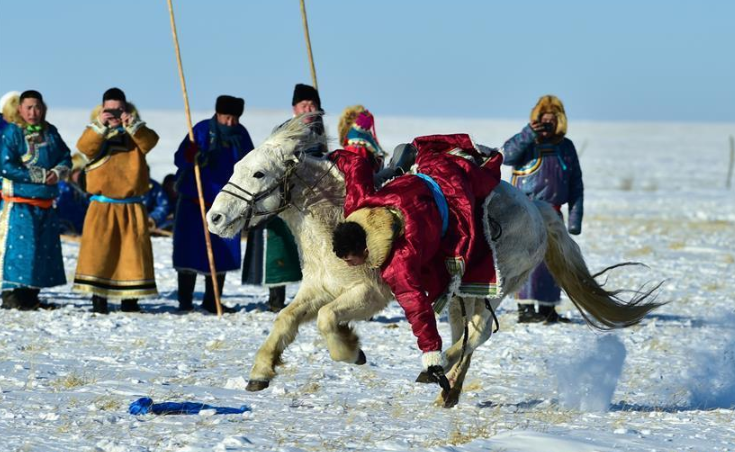 時(shí)下正值草原冬季旅游旺季,內(nèi)蒙古自治區(qū)西烏珠穆沁旗的牧民們?cè)谘┰弦徽股硎郑瑸橛慰驼宫F(xiàn)獨(dú)特的民族風(fēng)情。