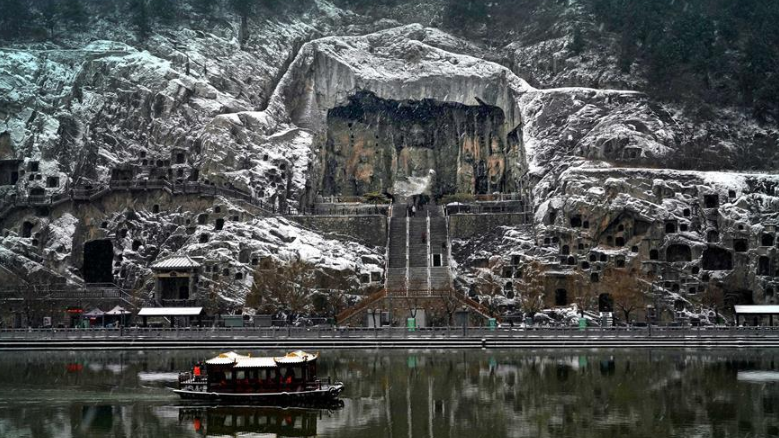 當(dāng)日,雪后的河南洛陽(yáng)龍門石窟景區(qū)銀裝素裹,一幅天然的水墨畫卷徐徐展開(kāi)。