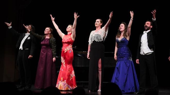 6月30日,在美國(guó)加利福尼亞州舊金山赫伯斯特劇院,歌唱家摩根·哈林頓(左)和安德烈亞·扎烏帕演唱《白毛女》選段《扎紅頭繩》。