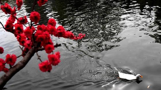 北京居庸關桃花盛開 列車穿行其中