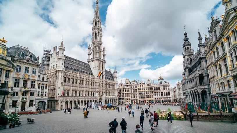 6月28日,兩名來自英國的游客在比利時布魯塞爾大廣場游覽。