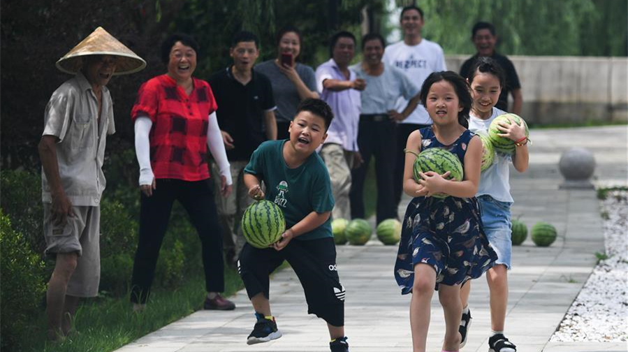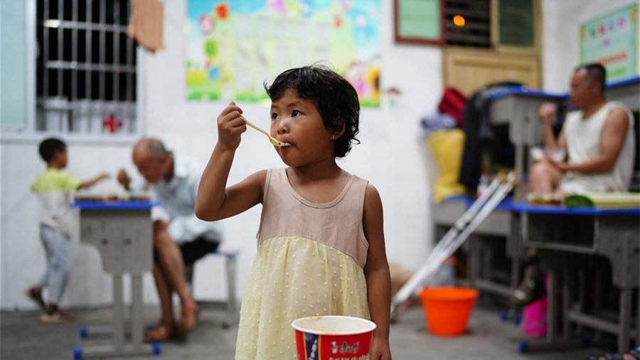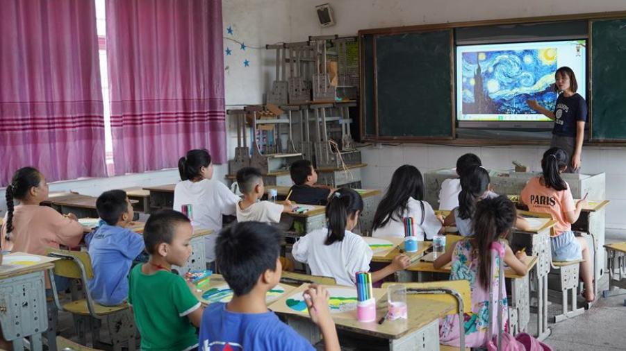 7月23日,在廬山市蛟塘鎮(zhèn)中心小學(xué)安置點(diǎn),小朋友在美術(shù)課上繪畫。