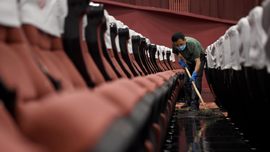 2020年7月23日,位于北京前門大柵欄的大觀樓影院的工作人員在影廳內(nèi)進(jìn)行復(fù)映前的清掃工作。