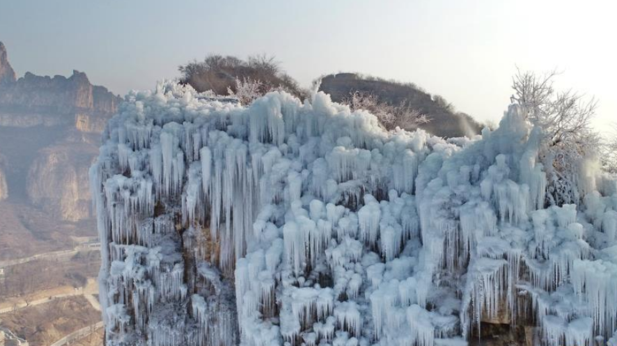 近日,河北省平山縣境內(nèi)的沕沕水景區(qū)出現(xiàn)冰瀑美景,形態(tài)各異的冰柱懸掛在山麓間,吸引游客前來觀賞。