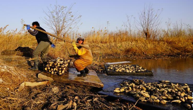 初冬時(shí)節(jié),河北省唐山市曹妃甸蓮藕豐收,工人們在結(jié)冰之前忙著采收蓮藕。