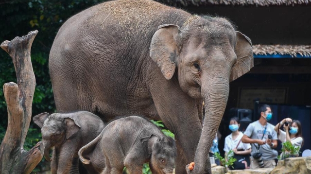 正在享受竹子大餐的廣州長隆野生動(dòng)物世界大熊貓婷仔被大熊貓隆仔搶食,兩只大熊貓上演一場爭食戲碼。