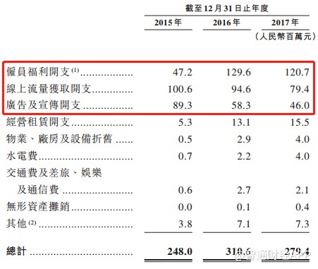 土巴兔的銷售人員開支從2015年的4720萬元大幅增至2016年的1.29億元,并在2017年維持1.2億元左右高位。不過隨著公司規(guī)?;\(yùn)營的展開,公司線上買量開支卻從1億元降至7940萬元。