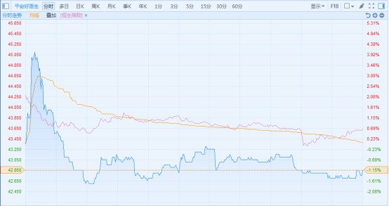 正式納入港股通的平安好醫(yī)生也明顯受到拖累。如果平安好醫(yī)生的分時圖和恒生指數(shù)的分時圖疊加,可以看出,平安好醫(yī)生早段有有迅速沖高的勢頭,但隨后受到大市的影響而轉跌,此后走勢與大盤幾乎同步。不過,平安好醫(yī)生走勢相對穩(wěn)健,最終僅跌1.15%,跑贏恒指,報價42.85港元,成交額1777萬港元。