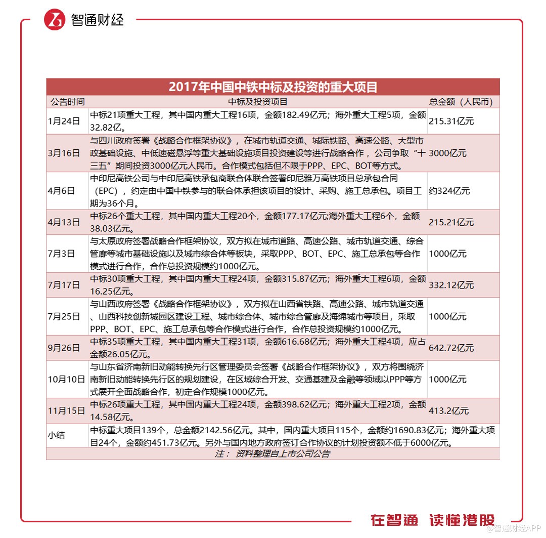 智通財(cái)經(jīng)APP注意到,雖然新簽合同金增速放緩,但中標(biāo)的重大項(xiàng)目卻大幅增加。據(jù)披露,中國中鐵上半年中標(biāo)的重大工程項(xiàng)目(不含與地方政府簽訂的戰(zhàn)略合作協(xié)議)達(dá)到102個(gè),而去年同期僅為49個(gè),涉及項(xiàng)目的金額更是后者的近3倍。