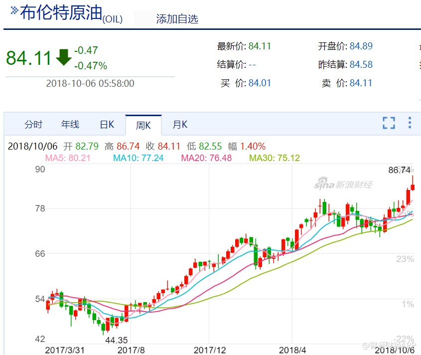 油價(jià)漲勢(shì)仍在持續(xù)。10月3日,布倫特原油盤中突破85美元/桶關(guān)口,創(chuàng)下近四年新高,這已是布倫特油價(jià)連續(xù)第5個(gè)季度上漲,是2007年初以來最長(zhǎng)的一個(gè)上漲周期。