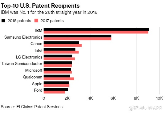 根據(jù)Fairview Research旗下IFI Claims Patent Services的分析,僅IBM一家公司就獲得了9100項專利,保住了其第一名的位置,并將IBM的連勝時間延長到了26年。