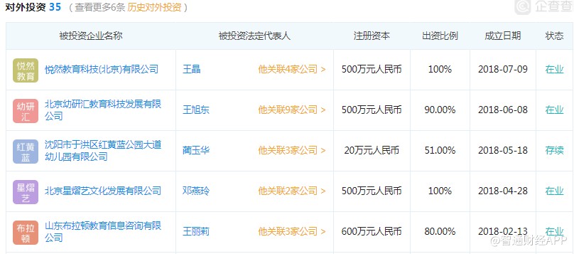 不過,在內地業(yè)務上,該公司今后的發(fā)展方向或也會出現一些變化,教育衍生品或將是該公司投資方向,以該公司2018年投資的標的來說,根據企查查的數據,該公司投資成立的大部分是教育相關的服務。以下為企查查搜到的紅黃藍2018年投資成立的項目: