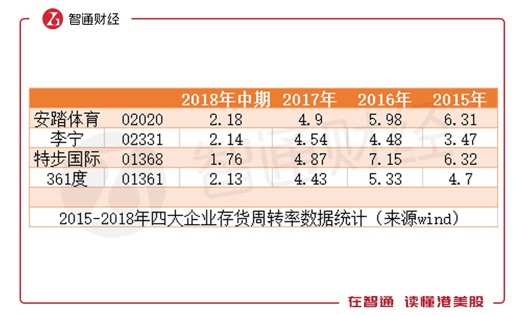 2015年時,李寧雖扭虧為盈,但在存貨周轉(zhuǎn)率上,與競爭對手仍相差較遠。李寧當時的存貨周轉(zhuǎn)率僅3.47次,而安踏體育(02020)為6.31次,特步國際(01368)為6.32次,連361度(01361)也有4.7次。