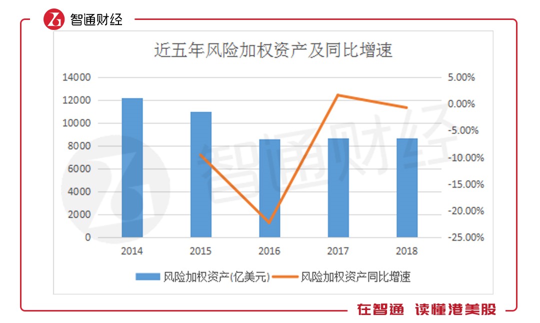風(fēng)險(xiǎn)加權(quán)資產(chǎn)方面表現(xiàn)與總資產(chǎn)類似,于2017年大幅增長(zhǎng),至去年有所回落。據(jù)智通財(cái)經(jīng)APP了解,2018年,匯豐控股風(fēng)險(xiǎn)加權(quán)資產(chǎn)達(dá)8653.18億美元,同比下降0.69%。