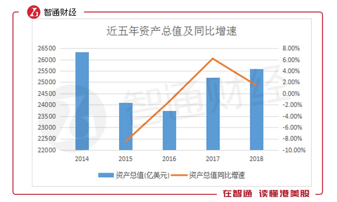 2018年,匯豐控股資產(chǎn)總值規(guī)模達(dá)26341.39億美元,較2017年同比增長(zhǎng)1.44%,增速有所放緩。追溯歷史,匯豐控股總資產(chǎn)規(guī)模下降開始于2012年,自2015年起降幅縮小,并重新擴(kuò)表。至2017年達(dá)到大幅正增長(zhǎng),而于去年增速放緩。