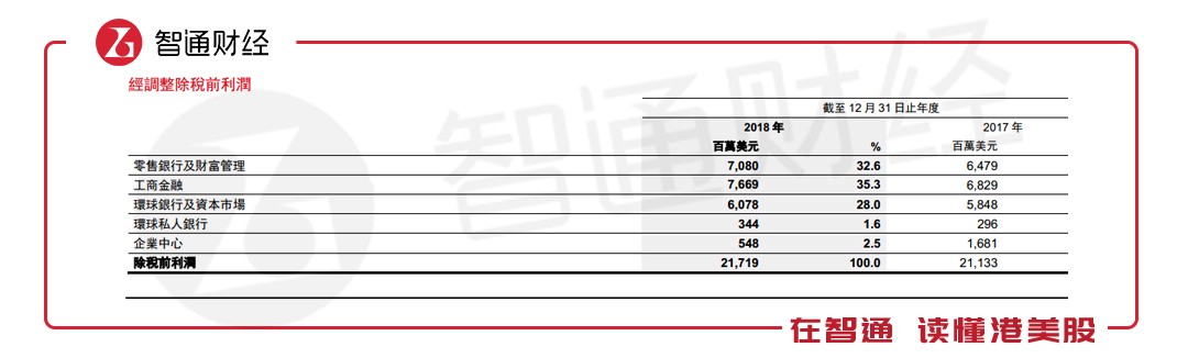 剖開業(yè)績(jī)來看,2018年匯控四大環(huán)球業(yè)務(wù)的經(jīng)調(diào)整收入全面增加。整體而言,依然形成零售銀行及財(cái)富管理業(yè)務(wù)、工商金融業(yè)務(wù)、及環(huán)球銀行及資本市場(chǎng)三足鼎立的布局。