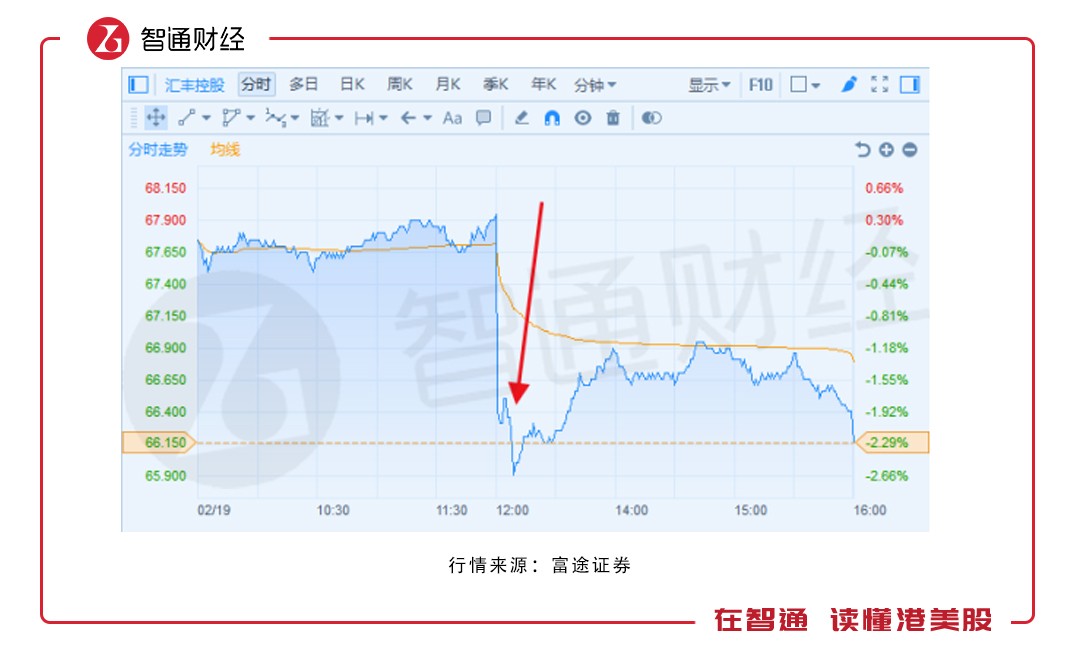 自午間業(yè)績(jī)公布后,匯控股價(jià)出現(xiàn)斷崖式下跌,雖隨后有所回升,但整體依舊無力回天,最終以66.15港元收尾,跌幅2.29%。