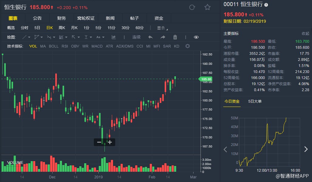 截至發(fā)稿,恒生銀行(00011)微升0.11%,報(bào)185.800港元。(劉大洋)